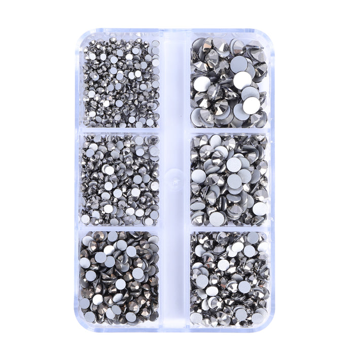 Mixed Sizes 6 Grid Box Hematite Glass FlatBack Rhinestones For Nail Art Silver Back